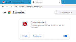 In dit scherm zet u het blauwe bakje bij de Telefoonintegratie.nl extensie staan. Zet deze een keer uit en aan.